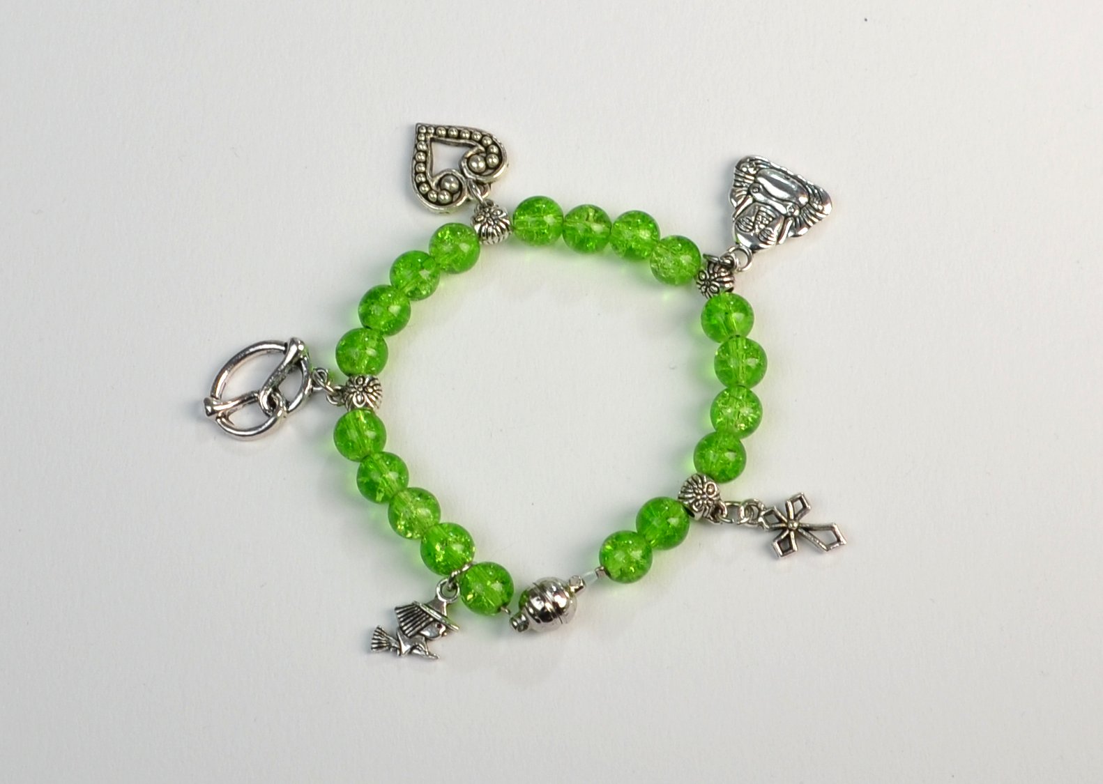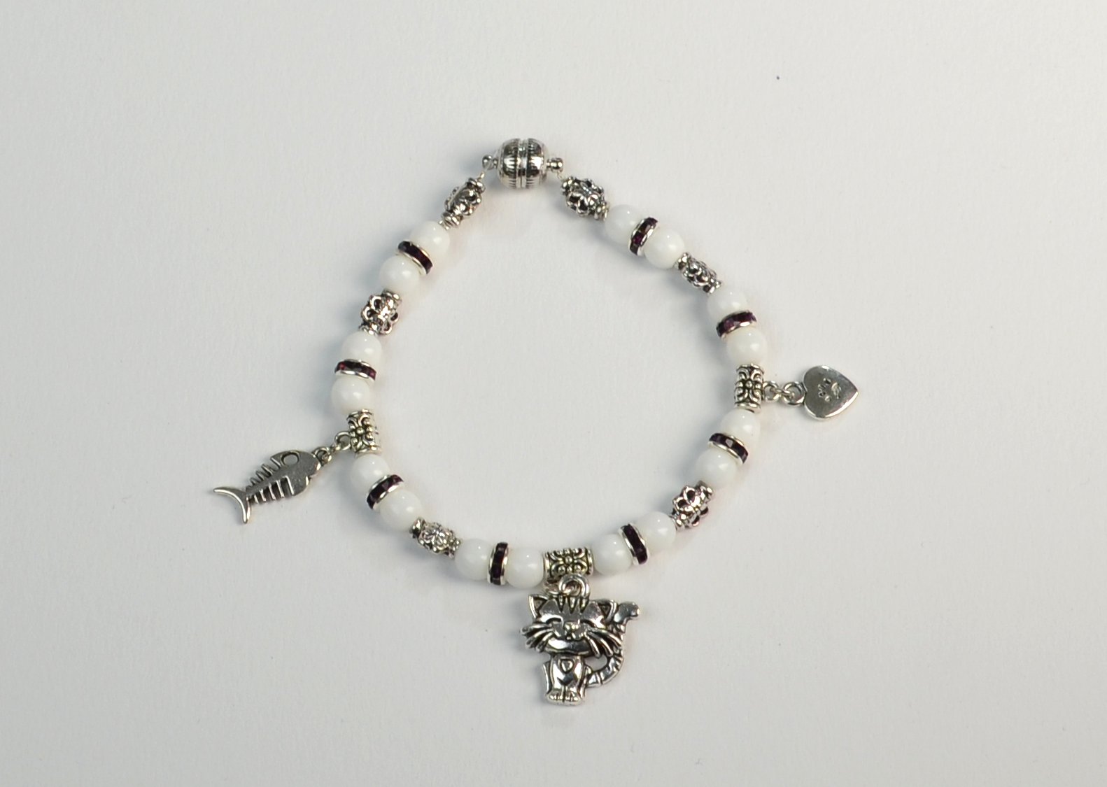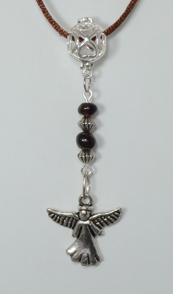 Weiße Glasperlen, fliederfarbene Glassternchen, dunkel fliederfarbene Bicone Glasschliffperlen, rundes Medaillon mit Engel | Verschluss: Kugelmagnet, silberfarben