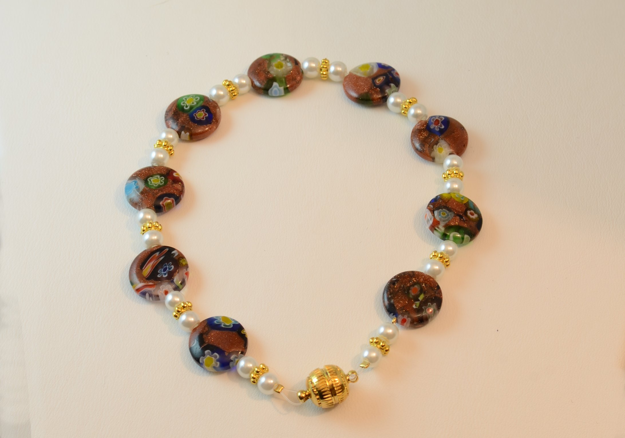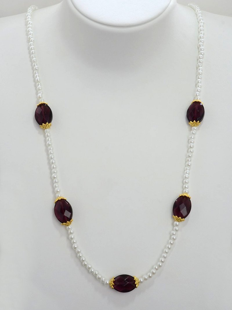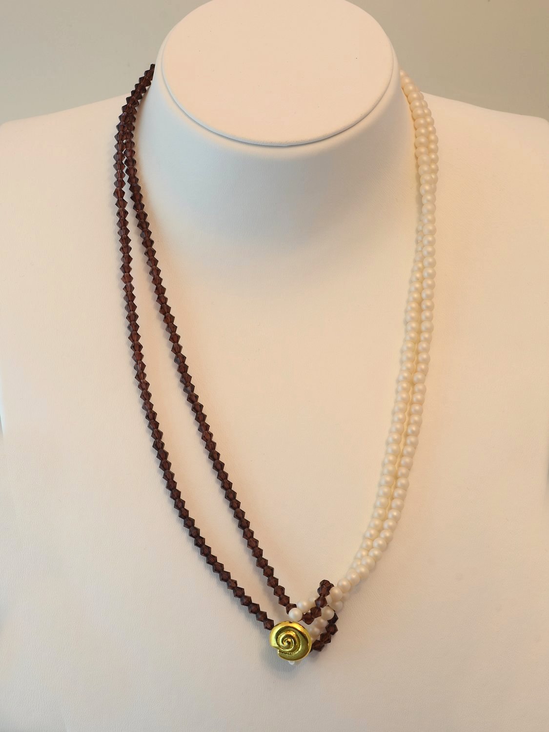 Knotenkette mit facettierten Glasschliffperlen violett, Glaswachsperlen mattweiß, Metallelement Schnecke goldfarben | Verschluss: Magnetverschluss in Kugelform, goldfarben