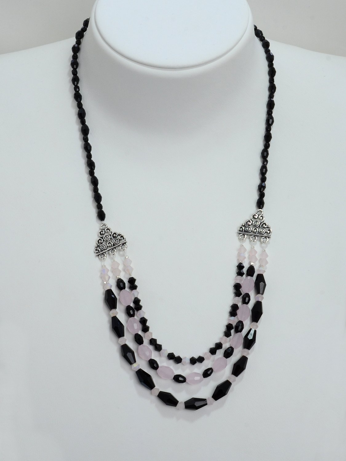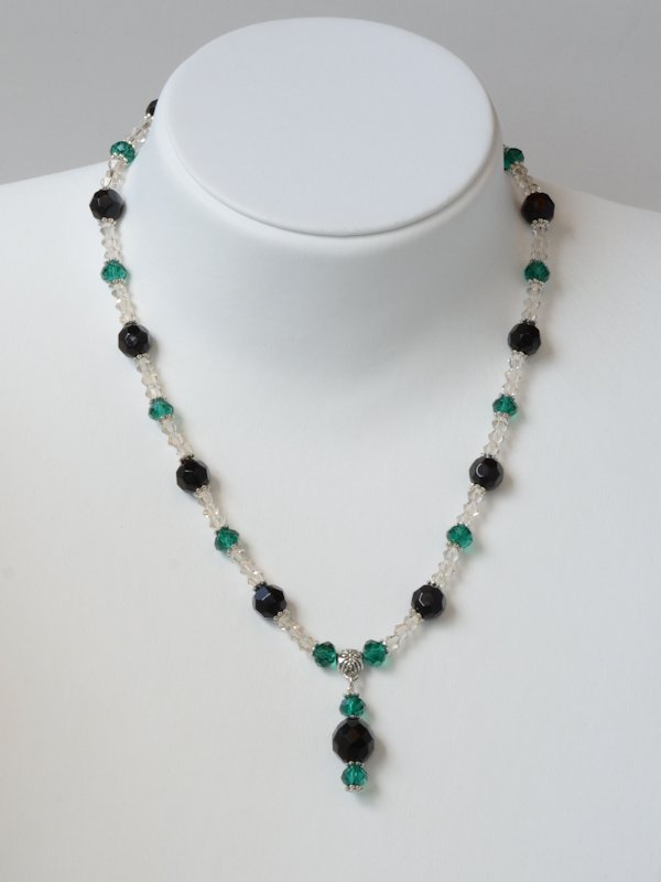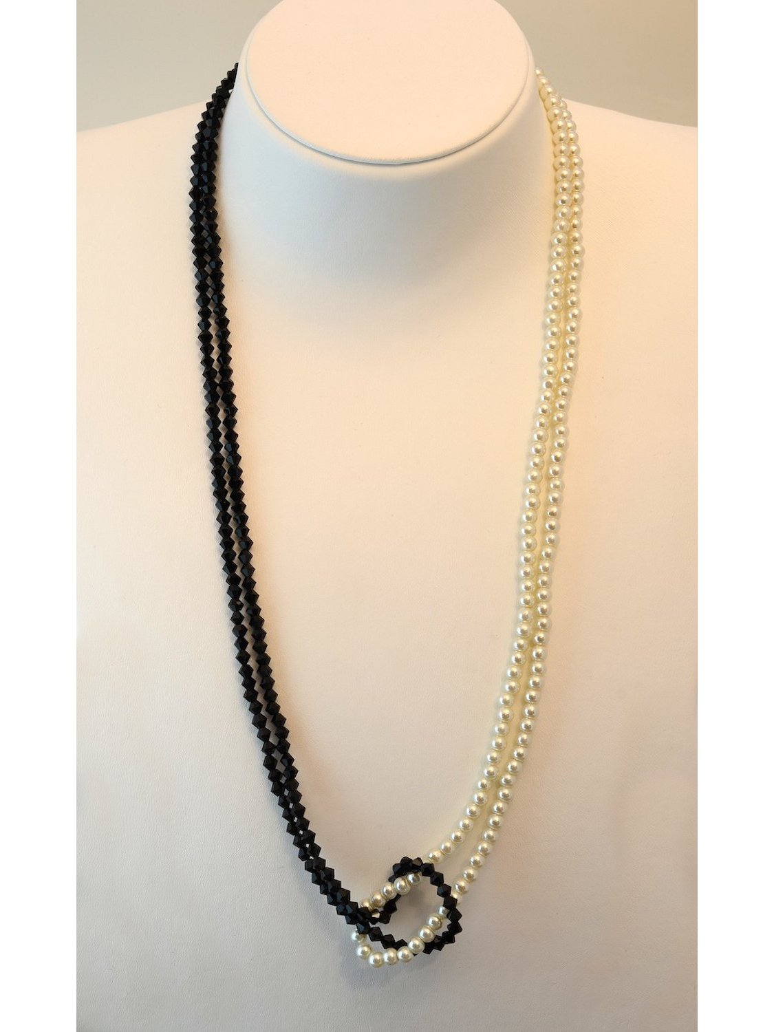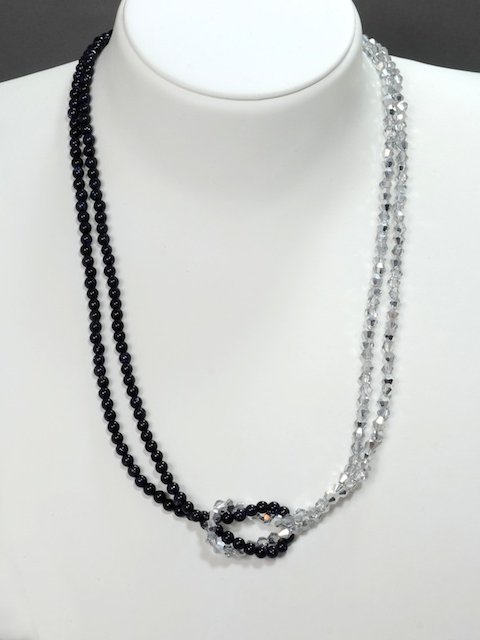 Knotenkette mit facettierten Glasschliffperlen schwarz, Glaswachsperlen silberweiß | Verschluss: Klemme mit Bl